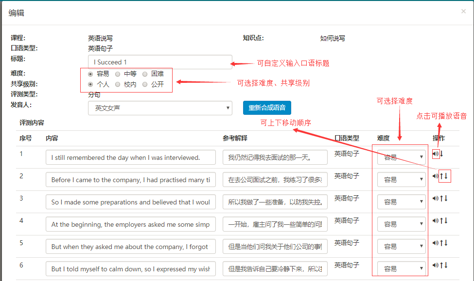 1、点击下图中的图标进入口语编辑页面 编辑口语资源 编辑口语资源2 2、如下图,编辑后点击确认并保存 编辑口语资源3